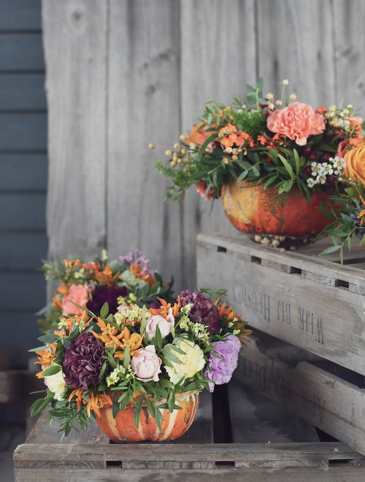 Sidomme sesongissa olevista kukista ja kauden vihreistä joko pyöreän tai veneenmallisen asetelman. Voitte toivoa sävymaailmaa asetelmalle.